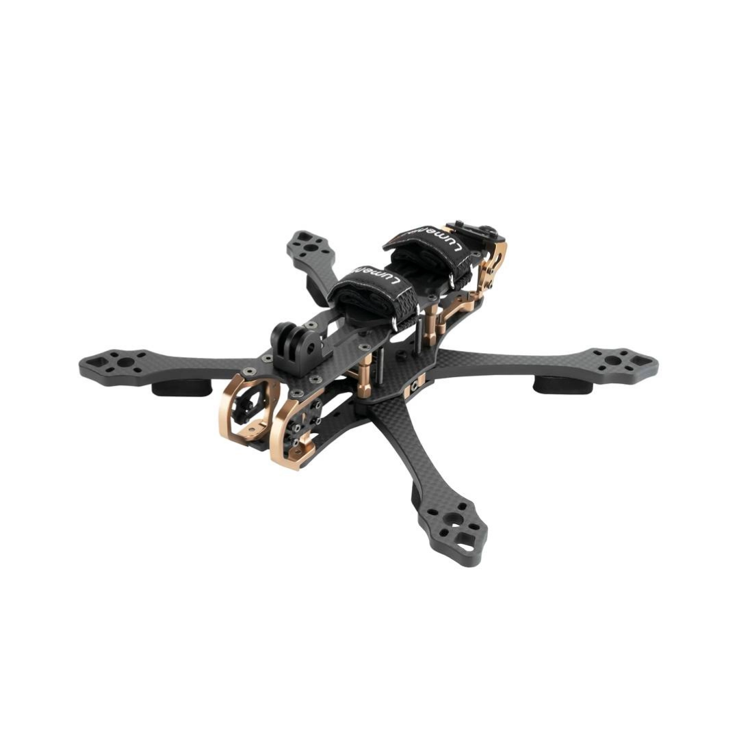 Este frame, desarrollado en colaboración con JohnnyFPV, está fabricado con aluminio 6061 y fibra de carbono 3K de 6 mm, logrando un equilibrio perfecto entre resistencia y peso, con solo 133 g en su estructura base.